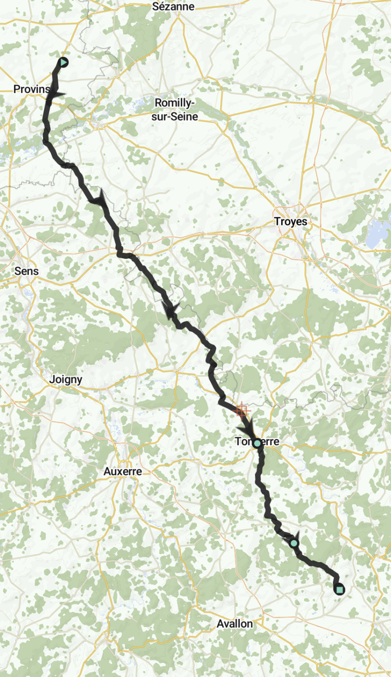 We rijden Bourgondië binnen. Bosrijk gebied wordt afgewisseld met opnieuw tientallen kleine gehuchten. We rijden een tijdje parallel aan de rivier de Armaçon waardoor we in de enige noemenswaardige gemeente, Tonerre, terecht komen. Een terrasje weigeren om op krachten te komen om de laatste 45 kilometer aan te vatten wordt moeilijk.
